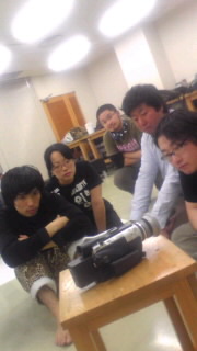 もうテンションはマックスです。前日にみんなで学校に泊まり込んで合宿稽古をしました。深夜3時位まで稽古。ちょっとみんなで仮眠をとってる間、僕はまだ未完成の装置のカウンターテーブルを作ってました。朝5時まで。 んでもって何故か中庭で。深夜です。めちゃくちゃ怖いですよ。