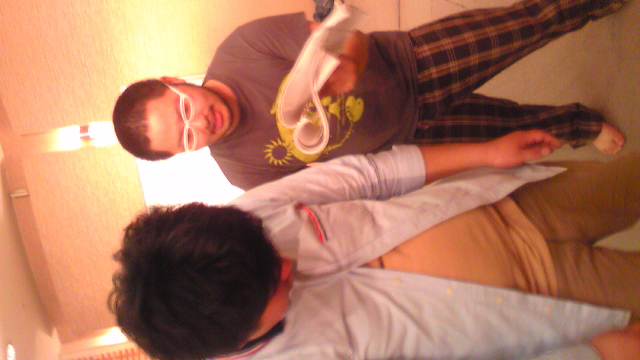 夜稽古は音響のキッカケを中心にシーン稽古を進める。マキちゃんがかっぱに行っている事をいいことに、代役しまくるヒロヤスいなべ。写真はごうちゃんと代役いなべによる、あのシーン。
